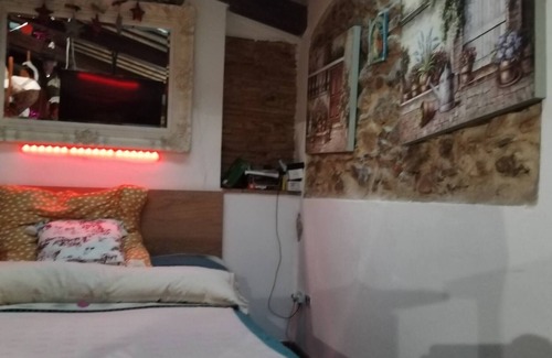 On the second floor, a multifunctional and delightful double bedroom, embellished with bricks hand-painted by esteemed local artists, with attention to the smallest details with a sliding wardrobe consisting of a double bed and a