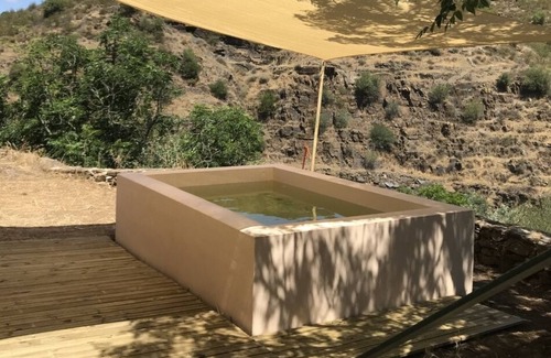 The "Engineer's House" comes from the rehabilitation of the home of the engineer-head of mines at Las Herrerías, located at one end of the row of houses in Puerto de la Laja. The spectacular mineral pier and the village on the banks of the Guadiana River have been declared a Site of Cultural Interest by the Junta de Andalucía. The three existing chimneys are conserved in the two rooms and kitchen of the original house and the oven in the patio, the true heart of the house. Private pool 3.2 x 2.2 x 0.9 m, in season