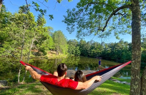 The Lake House is an exclusive separate property located .25 miles from the main Longleaf Piney Resort campground and Longleaf Trace. The Lake House has two master suites. One suite includes a King bed and full futon that can sleep four with an ensuite bathroom and private deck overlooking our lake. The other suite has a Queen bed and full futon that can sleep four with an ensuite bathroom and beautiful view of our lake and forest. Both rooms are connected with a large common living, dining and kitchen area and third full bathroom. The kitchen includes an electric range oven and stove, refrigerator/freezer, stand-alone ice maker, on-demand drip coffee maker, and dishwasher. We also include all of your cooking and eating dishaware, drinkware, and utensils to make you feel right at home. Our dining area has a table to fit eight and a separate pub table that could fit another four. Our living room is walled with windows that overlook our beautiful lake and piney woods. We have two queen sleeper sofas that could sleep an additional four people. Our back door opens to our patio area that includes outdoor dining for six, propane grill and more comfortable seating options to sit back and enjoy the view. From our patio you can walk down to our waterfront dock if you want to be over the water. We are only .25 miles from the Longleaf Trace if you want to take a ride or a hike. The Lake House and property is exclusive to Lake House guests.