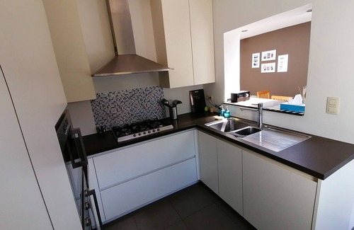 - aansluitend volledig ingerichte keuken met vaatwas, oven, diepvries, microgolf, toaster, nespressotoestel, waterkoker,