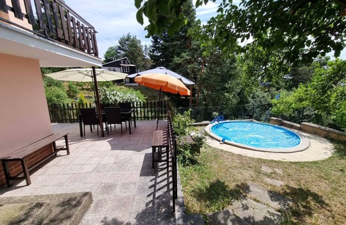 Two-story house with a large terrace, self-catering, is romantically located on a mountain with a view of nature. City of Brno 2 km, 15 minutes by car to the city center (theater, English cinema, concerts). Excursion to Prague: 1.8 hours and Vienna 1.5 hours. Leisure activities with bicycles or cross-country skis in the forest area 300 m away. 1 km Brno dam, 3 km Brno ZOO, 20 km Moravsky kras (beautiful stalactite caves). This house offers 1 or 2 families a wonderful vacation in a very beautiful nature and the entertainment of a big city. And all this with maximum comfort. In the house there is: large kitchen with fireplace (microwave, dishwasher, washing machine, sofa bed for 1 p.) With terrace (swing, grill, sandpit), 1 bathroom with shower, 1 floor: living room with fireplace (sofa bed for 2 p .), small bedroom (2 beds), dressing room, 1 small bathroom. 2nd floor: large bedroom / living room + cot on request (2 beds), hallway (3 beds).