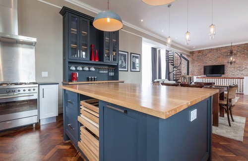 The middle floor of the apartment has an open plan living area (with a fabulous wood-burning stove), dining area (with a huge dining table) and gourmet kitchen with slate counters, bespoke handmade cabinetry and stainless steel Smeg appliances. All of which creates an amazing homely room to hang out in. The Middle floor also has air conditioning.