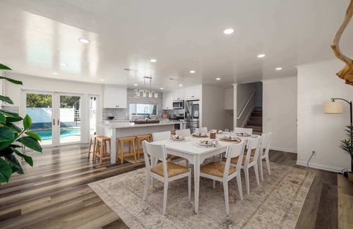 Enjoy a bright, open-concept kitchen and dining area with plenty of natural light and direct access to the pool through sliding glass doors. The dining table seats 8, with additional bar seating at the island — perfect for family meals or entertaining. The kitchen is freshly updated and fully equipped with premium appliances, including a dishwasher, coffee maker, and all the essentials you need for cooking and dining with ease. Whether you're staying in for a home-cooked dinner or grabbing coffee before the beach, this kitchen is designed to feel like home.