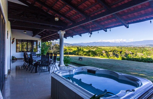 The backyard with views of volcanoes and the most amazing breeze, is equipped with a table for ten and jacuzzi.