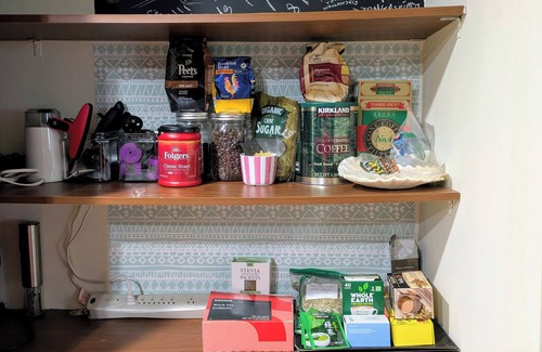 Coffee Bar with Keurig Machine and French Press with assortment of teas & coffees (whole and ground).