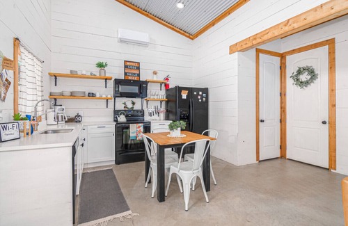 Beautiful view from the front porch, high ceilings let in tons of natural light. Full kitchen with butcher block countertops. A large L shaped sofa in the living area. California King Tempurpedic bed in the bedroom! Full bathroom. This is the perfect getaway for a small family!