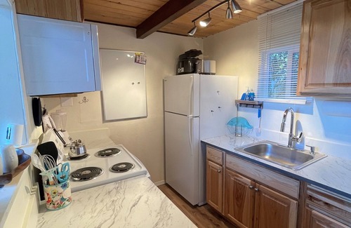 This newly remodeled 1 bedroom/1 bath cabin is well appointed with all the comforts of home, including fully stocked kitchen, WiFi, electric BBQ, electric fireplace, W/D, kayaks and fire pit. Master bedroom has a king bed and queen sleeper sofa in the living room.