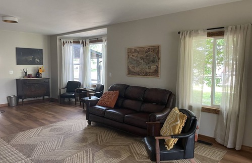 A comfortable, home away from home. The porch offers a great outdoor space for evening entertaining. All the living spaces are for visiting, game night, or relaxing with others without being squished in. This is a great place for many to gather.