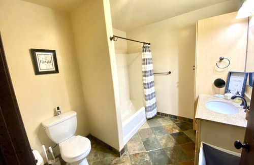 Our beds are: 2 Queens and 1 Full-size futon. Split level gives privacy on lower floor. There is 1 smart TV, washer and dryer.