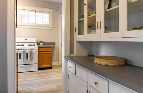 - Kitchen- Fully equipped with a gas stove, refrigerator, oven, dishwasher, microwave, toaster, and coffee maker. We offer coffee, sugar and creamer with your stay. Contains pots, pans, cutlery and other necessary items like oil, sugar, salt and pepper. We also have plates/cups/silverware.
