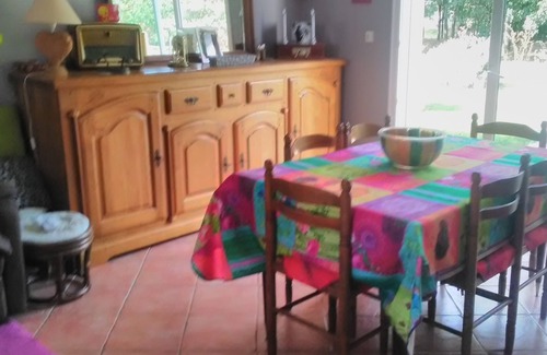 Our terrace is open on a plantation of oaks. Single storey house with a walk-in shower and a fitted kitchen.