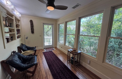Welcome to Ibis Roost 10, a cozy and accessible vacation cottage perfect for small families, including elderly and mobility impaired guests. This unique home offers ramp access and a wheelchair accessible bath to ensure safety, comfort, and independence for all guests. Located in the serene old growth Maritime Forest, Ibis Roost 10 is also an art-lover's paradise, boasting a 10-foot tall Tsimshim totem pole, a captivating brass sounding sculpture, and indigenous art that will delight both children and adults. The simple yet functional floor plan features an open living and dining space with an excellent sound system, a well-appointed kitchen, and a variety of books, videos, and board games for your entertainment. One of the highlights of the cottage is the glassed porch that overlooks the picturesque maritime forest, providing a tranquil retreat to observe the local wildlife. Additionally, the screened front porch is perfect for dining al fresco and socializing with neighbors.