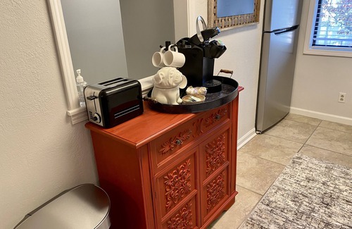 The small, quiet complex has plenty of free parking, and this unit has high speed WiFi and cable, smart TVs, a fully equipped kitchen including a Keurig with coffee/tea pods & condiments provided for your convenience. Each of the bedrooms feature comfortable beds with pillow top mattresses and upgraded linens, smart TVs, and attached full baths. All linens and upholstery are sanitized between guests, and the unit also features a self inflating elevated queen air mattress with extra linens to accommodate groups larger than 4 (which can be set up prior to your arrival, upon request). An additional half bath is located downstairs, right off the living area.