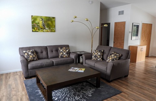 The Lodge is a newly converted three-unit building with accommodations from one or two to up to six, depending upon the unit. Each unit is self-contained. All units share a common entrance with separate, dedicated access to each unit. This one, Unit 3, is located on the second floor with a sweeping view. It features one bedroom, a living room with a sleeper sofa for an additional nominal fee, a dining area, a kitchenette with two-burner electric radiant ceramic cooktop, microwave, mini fridge, hot water kettle, and a separate bathroom with a tub/shower.