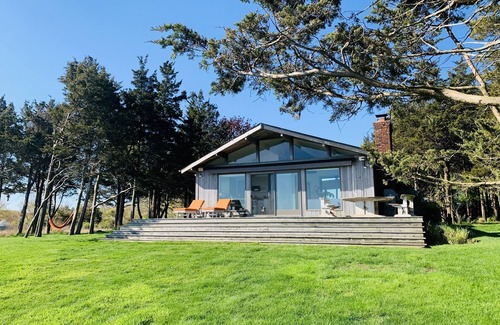 East Hampton contemporary hideaway at the water's edge and overlooking Gardiner's Island and the Napeague shoreline. Walls of glass frame the view from the living room which has a wonderful stone fireplace. Great kitchen also with big views. Two lovely bedrooms, one bath. Lounge on the deck, in the hammock or walk along the shoreline. This is the perfect Hampton's rental retreat.
