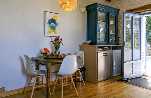 Our larger villa, Le Prunier, invites you to discover its warm and relaxing atmosphere. The spacious kitchen with a table that seats ten is perfect for gathering and sharing meals together. The living room, complete with a TV with Chromecast for streaming and a Bluetooth speaker, offers a cozy retreat for your entertainment needs. Both the kitchen and living room feature wood burners to keep you warm during cooler months, while the stone walls help maintain a pleasant temperature in the summer. A double bedroom on the ground floor features an en-suite bathroom.