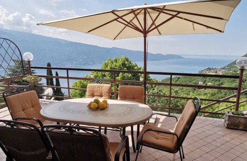 The spacious apartment "Il Patio" is located on a side street of the panoramic road that leads to the district of Aer. Lake Garda is approx. 7 km away. The apartment was tastefully renovated in summer 2021 and equipped with every comfort. The apartment has its own entrance and has its own large terrace. From this you have a wonderful unobstructed view of Lake Garda and the opposite Monte Baldo. You can either linger on the terrace seating area or comfortably on the lounge in the sheltered loggia and enjoy the wonderful view of Lake Garda. The two sun loungers in the lower area of the terrace invite you to sunbathe. Due to the unique location of the apartment, a large parasol and the mild summer wind that blows over the terrace, it never gets too hot on the terrace. There is also a parking space in the partial shade belonging to the apartment.The apartment has a living / dining room with kitchenette, a bedroom with a double bed, an adjoining room with a single bed and a spacious bathroom with a large shower. The bedroom is separated from the adjoining room with an archway. An additional cot is also available.The adjoining rock wall in the storage room in the rear part of the apartment ensures a pleasantly cool room climate in the apartment even on hot days.The kitchen includes a gas stove with four burners, an extractor hood, a microwave, a dish washer and a filter coffee machine. There is a freezer compartment in the refrigerator.The apartment has satellite and terrestrial TV, WLAN and DAB radio.The town centers of the two villages Gardola and Aer with shops, cafes, restaurants and entertainment facilities are just a few minutes' walk away at the same height level.Sport and health: the outdoor swimming pool in Prabrione is 2 km away. Tennis court is 300 m away.The apartment is an ideal starting point for hikes and mountain bike tours. Mountain bikes and bicycles can be rented in the village in the Tabaccheria Ferrero. Sailing and surfing is possible right in the port of Tignale. The Bogliaco golf course is approx. 13 km away. On the day of arrival, our guests receive two discount cards (TIGNALE CARD and REBOMA CARD) which enables them to receive various discounts, for example:•Guided hikes•Nordic walking•Free shuttle bus to and from the beach every day from April to October•Free entry to the public swimming pool in Prabione - from June to August•Discount in Restaurants, Cafés, etc.