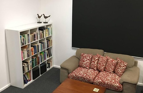 The lounge has a 65" flat screen tv and a library of books for your enjoyment.
