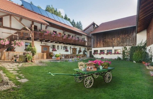 Unsere Ferienwohnung auf dem Erlebnisbauernhof für Jung und Alt liegt auf 800 m Höhe, direkt am Nationalpark Bayerischer Wald. Zwei Süddeutsche Kaltblutpferde für die Kutschfahrten, Pony Charly und Schneewittchen zum Reiten, Hasen, Hühner, Enten, Gänse, Puten, Forellen, Meerschweinchen, Katze Mietzi und Hund Willi, sind all unsere lieben Tiere. Eine Spielscheune, ein Hobbyraum mit Tischkicker, Tischtennis und Kegelbahn stehen für Ihre Indoor - Altivitäten bereit. Ein Grillplatz und ein Pfeil- und Bogenparcours an unserem Wald, Hofladen mit Bayerwald - Spezialitäten runden das Angebot ab. Weitere Aktivitäten auf unserem Spielplatz umgeben von den Tieren, gesellige Abende in unserem Hofstüberl, Wandern in seiner schönsten Form, mit dem Ranger durch den Nationalparkstreifen und viel Neues erfahren, Langlauf Loipe vor der Haustüre, Alpinsport und Wintersport jeglicher Art alles für Ihre Gesundheit. Hallenbäder und ein Naturfreibad befinden sich in unmittelbarer Nähe. Außerdem erhalten Sie bei uns kostenlos die AktivCard Bayerischer Wald. Unsere ca. 60 qm große, rustikal und ganz im Bayerwald-Stil gestaltete Ferienwohnung besteht aus Diele, Dusche / WC, Wohnküche, Sat-TV, sowie zwei Schlafzimmern und liegt auf der Südseite des Hofes mit eigener Terrasse und Anschluss an eine große Obstwiese. Die Küche ist mit einer Spülmaschine, einem Toaster, einer Kaffeemaschine, einem Wasserkocher, einem 4-Platten-Elektroherd mit Backofen, einem Kühlschrank und ausreichend Geschirr ausgestattet. An unserer Holzhackerstation, unserem "Outdoor-Fitnessstudio", können Sie Sägen und Spalten. Gerne organisieren wir für Sie Kutsch- und Schlittenfahrten oder Ponyreiten. Auf Wunsch bieten wir einen Brötchenservice mit frischen Hühnereiern von unserem Bauernhof.