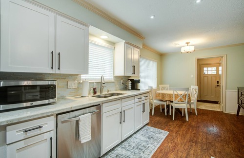 The home is a 2,200 one story with all bedrooms on one end of the house and the living spaces on the other. The entire home has been updated and features beautiful laminate wood floors everywhere except the 3 secondary bedrooms which have carpet. There is a front living room with couches and a SmartTV (online streamings services & Netflix) which opens to the formal dining room which seats 6. The family room faces the huge back yard and has high ceilings and a corner wood burning fireplace and is also open to the kitchen. Fully updated kitchen has everything you need for your stay including gas cook top, double ovens and all small appliances & cookware. There is breakfast room that seats 4 and a laundry room with a high efficiency washer & dryer and a half bath. The secondary bedrooms all have good size closets and share a large hall bath with dual sinks and a tub/shower combo. The master suite has laminate flooring, 2 closets, faces the back yard and the bathroom has a great shower and double sinks. Huge & relaxing back yard!