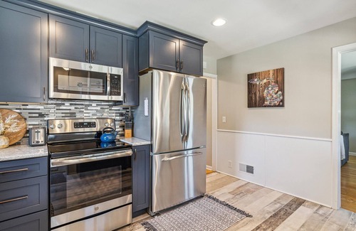 Charming 3 bed/2 bath, walking distance to Michigan Stadium. Peaceful, away from hustle & bustle of campus with serene walking trails close by. Remodeled, gourmet kitchen with stainless steel appliances. Enjoy super cozy living room & dining area, large sectional & 50' flat screen. Cable & WIFI, washer & dryer + supplies including complimentary coffee & bottled water. Huge 2nd living area in fully finished basement with massive sectional, flat screen, poker table and 16ft shuffleboard table! 2 car garage & plenty of parking. You will love the convivence to downtown Ann Arbor, Michigan Stadium, The University of Michigan or VA Medical facilities and the natural beauty of the Arboretum or the Huron River trail systems.