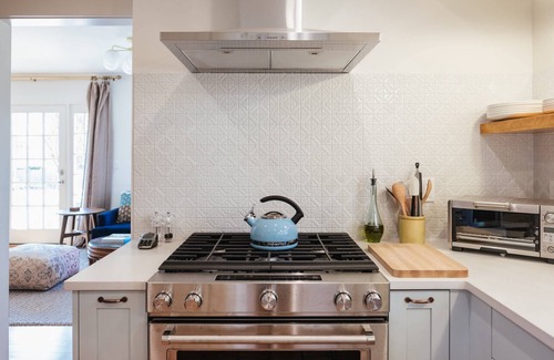 Outside, the beautifully landscaped back garden has a Weber natural gas grill, dining area that seats four, and an herb garden you are welcome to make use of. Parking for two cars in the adjacent driveway is available. The Bungalow's back yard connects with the View + Vine Cottage next door, which is available for rent together or separately, creating the potential for 3 bedrooms and 3 baths between the two homes and a joined outdoor space to host your group.
