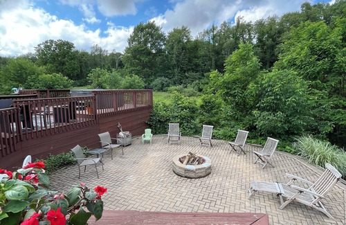 The house features spacious living areas indoors and outdoors, tastefully decorated bedrooms, 3 full bathrooms, and a fully equipped kitchen. An office is available for additional guests upon request, ensuring a safe and comfortable stay for families, couples, or groups of friends. There is plenty of room for entertainment within the open-concept home. Vaulted ceilings and large windows bring in sunshine and allow you to view the occasional passing deer. The walk-out basement offers a fantastic area for playing with family and friends, including a pool table, ping-pong, darts, video games, and a full gym. Step outside to enjoy the fresh air on our expansive patio, complete with outdoor seating, a flat-top grill, a lower-level fire pit, and a 6-person hot tub with breathtaking views of the surrounding landscape. You can relax and enjoy the sights and sounds of wildlife in the peaceful countryside.