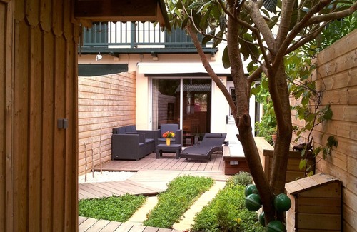 The living room separated from the kitchen by 1 convivial bar gives directly on 1 picture window with a beautiful perspective on the deep wooden terrace and the raised garden with its small fisherman's hut. The garden furniture with its deckchair, its sofa, its two armchairs and its outdoor bathtub (hot water) under a beautiful vine, no vis-à-vis thanks to the large all-weather awning. All in 1 cozy garden, all 15m deep. Movable electric barbecue.