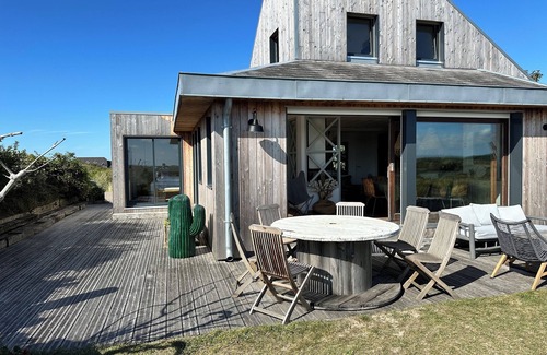 Spacious house with a large living room of 40m2 and bright with large windows overlooking the sea and the dunes. Ideal for a large family with 4 bedrooms, 2 with a bed of 160 cm, a room with a bed 140 cm, a room with 2 single beds 70, 2 bathrooms with shower and 2 toilets. All beds are equipped with a duvet. Sheets and towels are not provided. The outdoor wooden space consists of several terraces with deckchairs and outdoor furniture. In a quiet and private estate, wooden villa at the top of the dunes, surrounded by sand and greenery overlooking the sea and 300 meters walk from a huge sandy beach. Many activities or discoveries nearby: the Bay of Somme, the Marquenterre Park, the swimming pool Aquaclub Belle Dune, a golf course, the yacht club to practice sand yachting, equestrian center, acrobranche, tennis, bike paths and Hiking routes ... All shops are nearby.