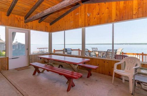 The large, screened-in porch spans the front of the cottage and offers a cooling retreat during the hot summer days. A picnic table and a variety of patio furniture ensure that guests will have plenty of space to eat and relax. The deck located off the front of the screened-in porch is ideal for barbecuing and overseeing the lakefront activities.