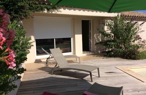 In the heart of a Provencal village, comfortable house for 4 people with 2 bedrooms (1 bed 160 and 2 single beds) Modern kitchen open to a living room (with TV) with bay window of the living room opening onto a flower garden and on the heated swimming pool (8m / 4m). Shaded outdoor summer kitchen.