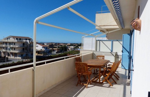 The covered veranda with awnings and with sea view offers a comfortable table ideal for excellent breakfasts and dinners outdoors.