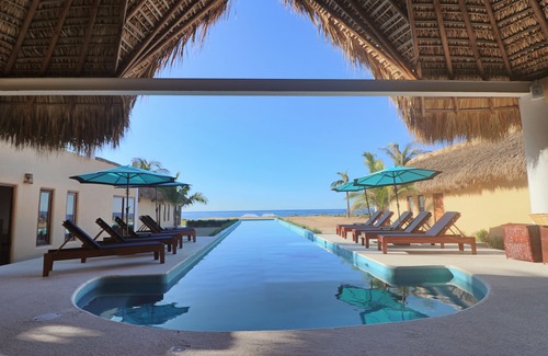 The house is located on a private beach, 25 min from Puerto Escondido airport, and 1.3 hrs from Huatulco intl airport. It has 10 rooms and a 40 mts infinity pool overlooking de pacific ocean. The house comes with cook, waiter, and cleaning. More staff can be arranged.