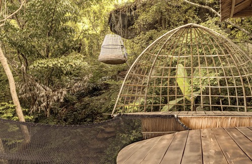 It features a 2,80m round god-sized bed with handmade linen, a bathroom with rain shower head opened towards the mind-blowing jungle, a 16m hammock to chill-out, a flying bed above the jungle, several seating areas, a minibar and your private outdoor cinema with projector on the lower floor to enjoy a good movie with Netflix. You have your private entrance with a small front garden and absolute privacy.