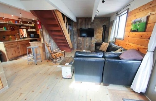 The living room is cozy and very relaxing with a leather sectional, the most comfortable rocking chair that you will ever sit in and a roku tv. The bathroom features a shower stall and a barn wood vanity with a vessel sink.