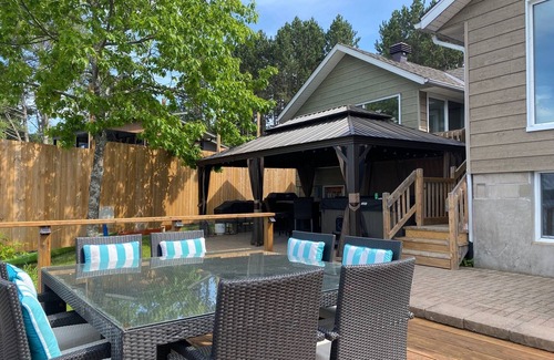 Outdoor Entertainment: 2 acres of flat property, section of forrest to discover, 135 ft of waterfront shoreline, 24X12 aluminum dock, 1000sqft deck, 14 Feet Upper Bounce Trampoline, Golf Net, badminton set, Bocce ball, ladder toss, ring toss, Paddleboard (with paddle), 2 junior kayaks, 2 adult kayaks, 2 large canoes (with paddles) & a 6x15ft water mat with a 1300lb weight capacity.