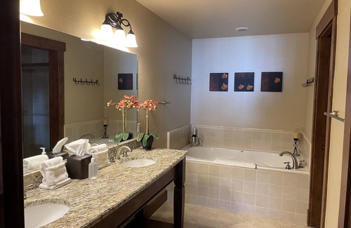 The Master unit has a king bed in the bedroom, full pullout sofa sleeper in living area, full bath with shower and a whirlpool tub, fully equipped kitchen, fireplace, balcony/patio, 2 televisions, 2 telephones, washer and dryer. Room assignment is determined by the resort.
