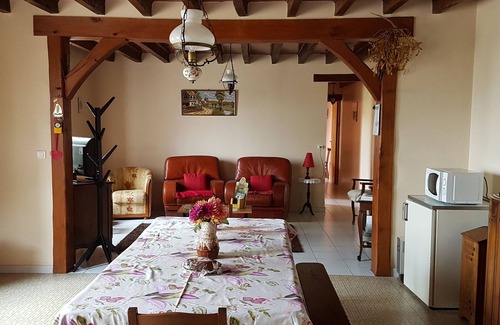 1km from the village, located in a hamlet, the gîte is independent with an enclosed courtyard and a very pleasant view of the Valley and the Sancerrois on the borders of Berry and the Loire Valley. The house is composed of a kitchen, a large living room (fridge/freezer, gas stove, electric oven and microwave, wood stove), a bathroom (shower, sink, WC, washing -laundry, towel dryer), as well as two bedrooms (one bedroom with 1 140x190 bed, then one bedroom with 1 140X190 bed and 1 90x190 bed).