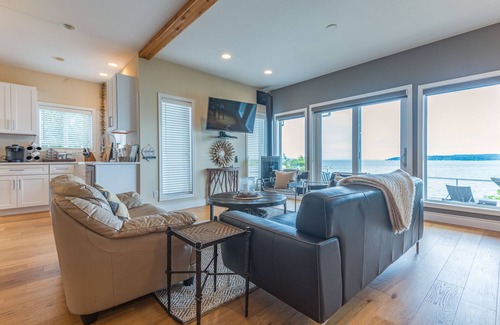 First level: Open the door to a waterfront view so near that it feels as if it’s part of the room! This level includes a 'great room' style living area with a gas fireplace and a big screen TV. A gourmet kitchen which includes a double oven/gas range, full size stainless appliances, maple cabinets, granite counters and a huge center island. A custom bathroom with walk-in shower, and a laundry room with a modern, full size washer and dryer. The living area spills off to a large 1500 square foot deck/patio area that includes a gas grill, ample dining, seating and lounging areas, an outdoor shower, and a fire-pit overlooking fabulous Puget Sound!