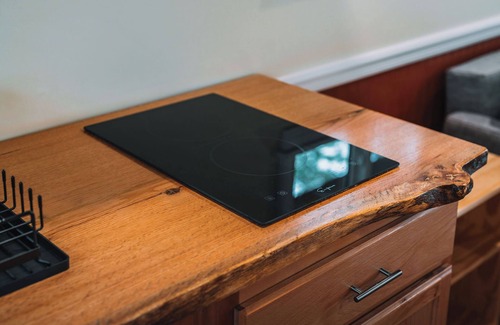 The fully equipped kitchen exudes an open-air charm with its four-burner electric stove, sink, 1/2 sized refrigerator and microwave. Additional amenities such as air conditioning, heating (mini-splits), a shared fire pit, and convenient access to the Natural Bridge State park and the rest of the gorge.