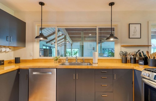 Perfect for groups, Wellspring offers a variety of indoor areas where everyone can spread out and relax. There are two living rooms, as well as a lofted game area. Between the large dining table and breakfast nook, there's seating enough for everyone. The renovated kitchen boasts refreshed countertops, cabinetry, and a backsplash, and is fully equipped with new cooking essentials and serveware for at-home meals. And with convenient grocery shopping less than 10 minutes away, it's easy to keep the kitchen stocked.