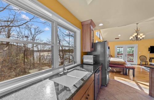 The homes top entrance level is handicapped friendly with entrance ramp. All doors are 36 inch wide and the walk-in master shower is approximately 5 by 8 feet. You will have your own private wooded cove and dock.