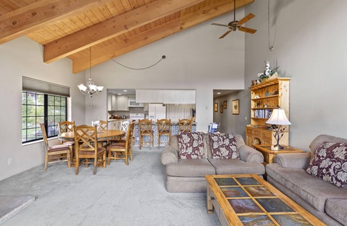 This condo is the perfect choice for your next stay in June Lake. It offers both comfort and modern amenities with incredible vistas of the lake and mountains. As you enter, you'll find a bedroom with a Cal King bed, followed by a well-appointed bathroom. A few steps further, you'll discover a convenient wet bar, a fully equipped kitchen, and the spacious great room.