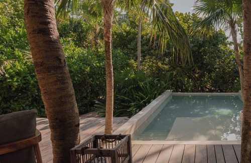authentic Mexican decor. Accommodating up to four guests, it includes two beautifully designed suites, with private bathrooms and a private pool; a spacious living room; a fully-equipped kitchen and dining room; and an intimate private terrace with its own plunge pool. While staying at Casa Chechén you can indulge at Aldea Canzul’s private beach, luxe concierge service, and all the exclusive amenities offered at the property.