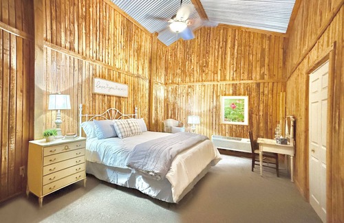 Dating back to the late 1930s, The Greenhouse was originally built by the Thomas Gay family as a hot-house for growing orchids. Today, this rustic home boasts a touch of Texas flair with its spacious family room, galley kitchen, three bedrooms, two bathrooms, and laundry room. Furnished with cozy sofas, plenty of chairs, tabletop games, reading nooks, and charming antiques, it offers a comfortable, vintage cabin feel that you and your party will surely love. The Greenhouse is also pet-friendly.