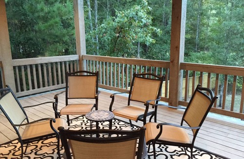 Gorgeous Custom French Country Home in gated Champions Retreat Golf Club (Designed by Nicklaus, Palmer, and Player) welcome to IronMan 70.3 participants and their family/friends. Southern Comfort at it's finest. Reclaimed brick from an Old NC Cotton Warehouse. Stunning double porches with slate floors, porch swing, and tongue and groove ceilings, 1200 sqft of porches. Heart of pine floors and crown molding throughout. Custom river rock showers. Coffered ceilings and wood accent wall in the downstairs rec/entertainment room. Surrounded by woods with deer common around the property. 6 bedrooms 4 baths on main and upper levels. 3 additional bedrooms and 2 additional baths available for larger parties in the lower level. Built in 2011