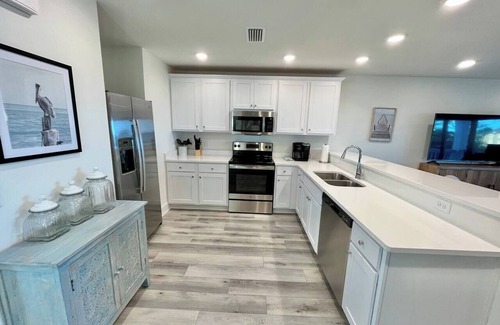 This is a 3 bed/3 bath is has all new furnishings, sleeps up to 8, & includes a fully stocked kitchen, laundry, & 2 kayaks!