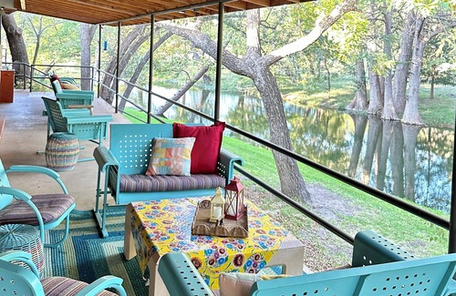 Spectacular Hill Country Private-Waterfront Retreat! Comfortable, curated, private, with 30 acres to roam. There is something for every age, hammocks for lazing, a river for floating and a huge covered designer pool and patio for gatherings.