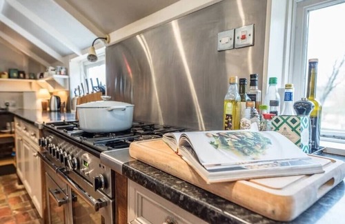 A handsome double aspect room with original brick floor and inglenook fireplace housing a wood burner. The kitchen’s equipped with a Rangemaster with six gas rings, a dishwasher, and a larder style fridge. This is a great space for long leisurely meals with family and friends at the refectory table with benches; a beautiful dresser is stocked with cutlery, napkins etc; and guests can unwind on the three-seater sofa.