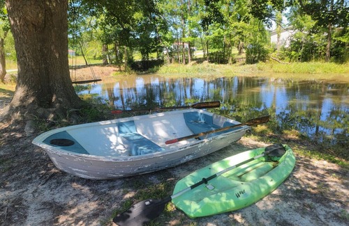 Coffee, basic cooking spices and oil provided, as well as a special gift to say welcome to our home! Very Spacious home with two large living areas, one with a pull out sofa bed. A large, beautiful kitchen, modern farmhouse sink, new countertops. Laundry room, covered back deck entry. Our home sits at the end of a long Country Road, very secluded, surrounded by woods. The pond (shared by one other Airbnb RV at the pond) is stocked with Catfish, Bass, Crappie, and Brim. There is a small boat for your enjoyment. If you like the idea of life in the country but with easy access to beaches, shopping, restaurants, USMC base, this is the place you want to stay. 15 minutes to Jacksonville and Camp Lejeune, 25 minutes to Emerald Isle, 35 minutes to New Bern.